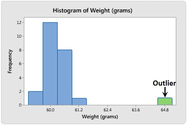 Outliers can be described as extremely low or high values that do not fall near any other data points. Sometimes outliers represent unusual cases. Other times they represent data entry errors, or perhaps data that does not belong with the other data of interest. Whatever the case may be, outliers can easily be identified using a histogram and should be investigated as they can shed interesting information about your data.