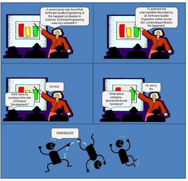 And that “Happiest Jobs in America” study? It suggested Software Quality Assurance Analysts were happy because they a) were key decision makers in the release of software and b) made an attractive salary. Commenters did not agree. In fact, the general consensus was that QA Analysts were powerless, underpaid, and miserable. The commenters concluded that the study must be flawed. The alternative was just too unbelievable.
