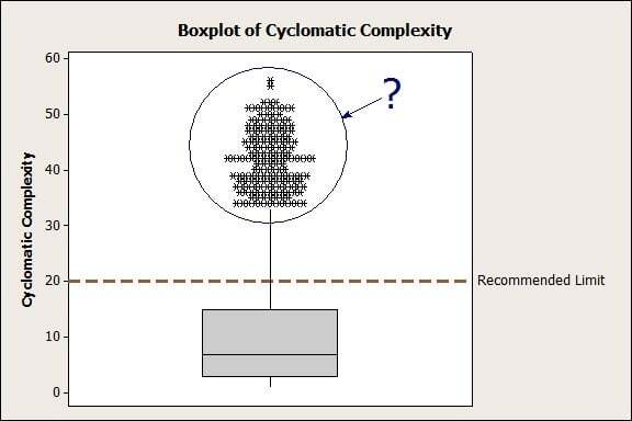 The boxplot below shows that most of the methods have a code complexity of less than 20; however, there are clusters outside of the limit. These are indicators of code that should be investigated.