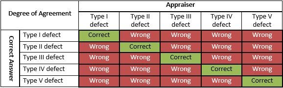 The table below shows the odds of by-chance agreement between correct answer and appraiser assessment: