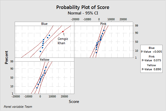A low P value in the normal probability plot (see below) signals a significant departure from normality. This p-value is below 0.05 for the Blue team. The points located along the normal probability plot line represent “normal,” common, random variations. The points at the upper or lower extreme, which are distant from the line, represent unusual values or outliers. The non-normal behavior in the probability plot of the blue team is clearly due to the outlier on the right side of the normal probability plot line.