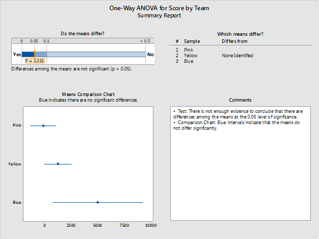 In this post, I will focus on team performances, not on single individuals. I decided to compare the average scores of each team. The best tool I could possibly think of was a one-way ANOVA using the Minitab Assistant (with a continuous Y response and three sample means to compare).