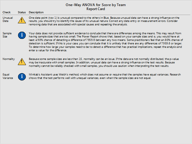 The Report Card (see below) from the Minitab Assistant shows that Normality might be an issue (the yellow triangle is a warning sign) because the sample sizes are quite small. We need to check normality within each team. The second warning sign is due to the unusual / extreme data (score in row 1) which may bias our analysis.