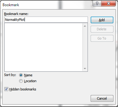 - Go to the Insert tab, click the Bookmark link, and type in the name of what you will be replacing. In this instance, I typed ‘NormalityPlot’ and clicked Add: