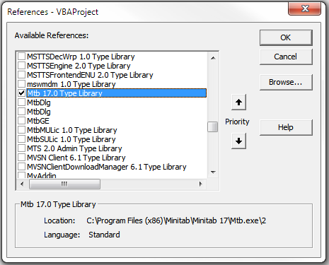 Let’s first make sure we reference the Minitab COM API, so Microsoft Word can talk directly to Minitab. In Visual Basic for Applications, go to Tools > References, and check the box for ‘Mtb 17.0 Type Library’.