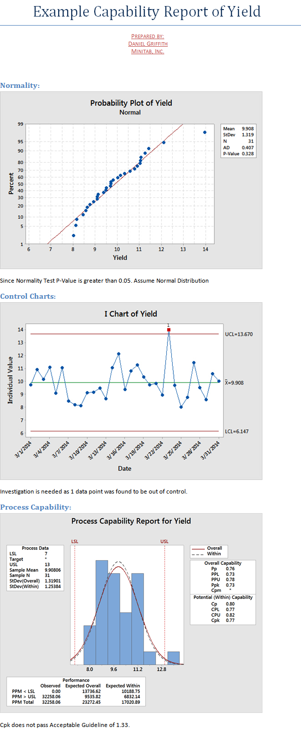 At this point, we have placed all the graphs successfully into the report. Let’s add some boilerplate text around the Normality test P-Value, the number of data points that are out of control, and whether or not Cpk meets our guideline of 1.33: