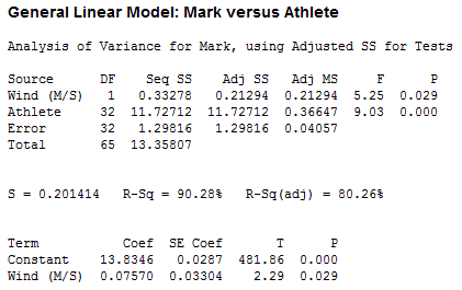 That's a pretty good model - most jumps are around 13-14 meters so a standard error of 0.2 meters is fairly small.  The coefficient on wind is 0.07570, so for every 1 meter/second increase in tailwind, you can expect a jump to be about .0757 meters further than the athlete would normally have jumped with no wind.  But what is the practical significance of that?