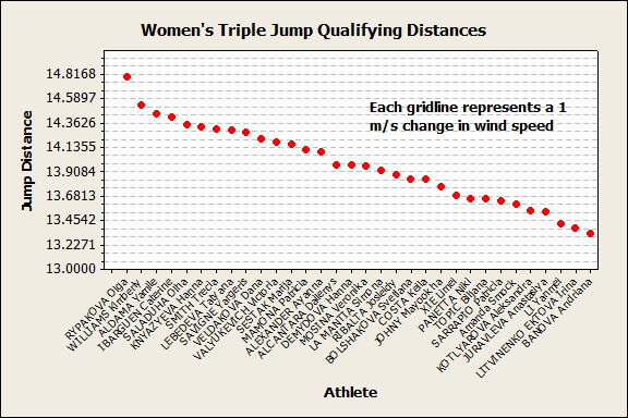 To investigate, I looked up this morning's Women's Triple Jump qualifiers and did some quick analysis that modeled the athlete and the wind: