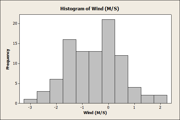 So from this we can see that having the wind 1 meter/second more advantageous would have put the last two silver medal winners into gold, and just over 2 meters/second would have moved the bronze medal winners into gold.  But how common are those wind speeds?  Here is a histogram of wind speeds from this morning's qualifiers: