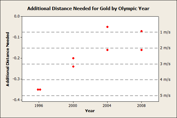 To see, I plotted the additional distance the silver and bronze medal winners from past Olympics would have needed to gain from the wind in order to match the gold medalist's distance, and included reference lines for wind speeds that would have been sufficient: