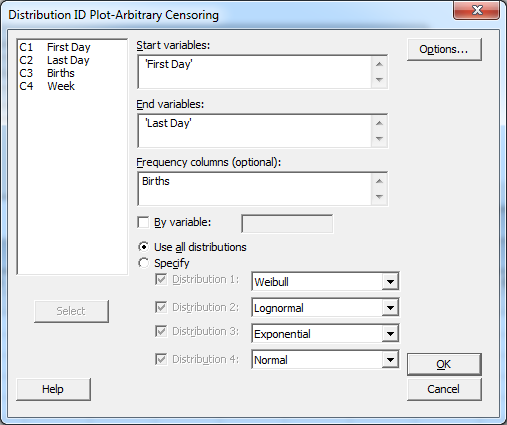 Data such as this, where we have a count of occurrences within a range of values (common when things are reported in whole days, weeks, etc.) but know the real distribution is on a continuous scale, is known as Arbitrarily Censored data. In this case I'd like to know the odds of the baby being born by certain days, which requires me to first find the distribution of the data. To do this I go to Stat > Reliability Survival > Distribution Analysis (Arbitrary Censoring) > Distribution ID Plot and complete the dialog like this: