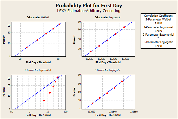 Based on the excellent fit on the probability plot and high Correlation Coefficient, I'm going to use the 3-Parameter Weibull distribution for my analysis: