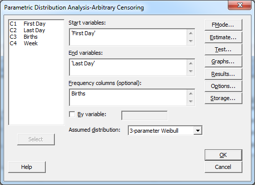 To learn some more about what this distribution means for when to expect a baby, I go to Stat > Reliability/Survival > Distribution Analysis (Arbitrary Censoring) > Parametric Distribution Analysis and complete the dialog like this: