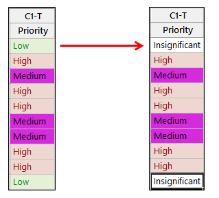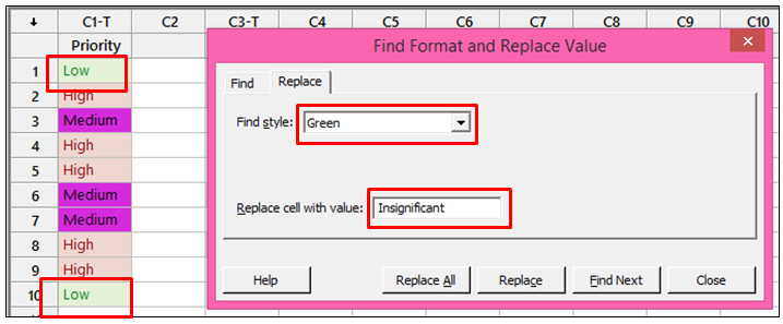For example, if we’ve applied conditional formatting to a worksheet to highlight cells with the value ‘Low’ in green, we could use the Replace tab to find all the cells that are green and replace the values in the cells with new values. For example, we can replace the ‘Low’ values that are marked in green with the new value ‘Insignificant’: