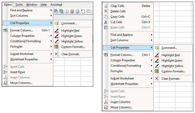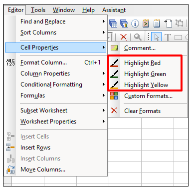 The new Cell Properties option in the Editor menu provides options for adding a Comment to the selected cell, to Highlight specific cells in the worksheet, and to create Custom Formats. These same options can be accessed by right-clicking on a cell and choosing Cell Properties:
