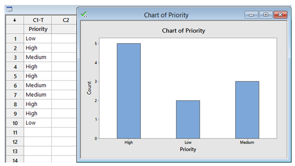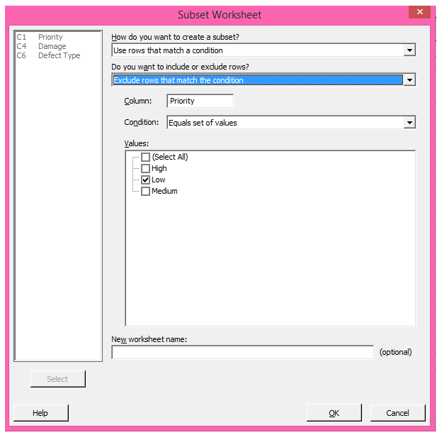 In this example, we’re telling Minitab that we want to use a condition when we subset- we want to Exclude rows that match our condition. Our condition is based on the column Priority. When we introduce that text column, Minitab automatically shows all the unique values in that column. We select Low as the value we want to exclude from the new worksheet, and then click OK. It’s that simple- no need to guess whether we need to type in single or double-quotes in the subset condition!