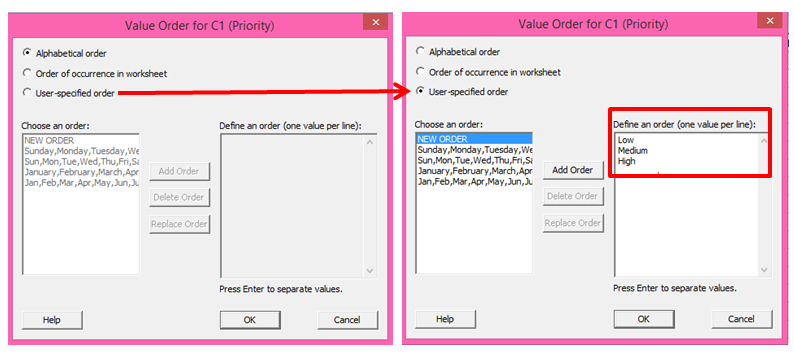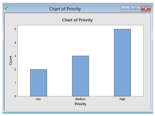 To change the alphabetical order default, we select the radio button next to User-specified order, and then edit the order under Define an order and click OK. Now the default order will be Low, Medium, High, and we can update our bar chart to reflect that change: