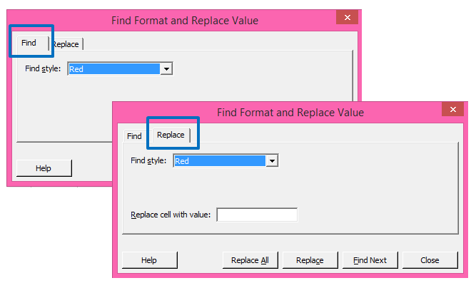 This section of the Editor menu includes options for Find Format and Replace Formatted Cell Value—either selection will display the Find Format and Replace Value dialog box: