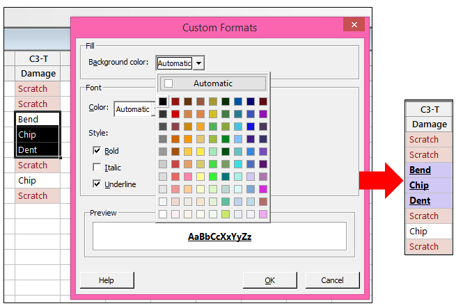 Let's consider some examples using features from Find and Replace (Find/Replace Formatted Cell Value), Cell Properties (Comment, Highlight & Custom Formats), Column Properties (Value Order) and Subset Worksheet (Custom Subset).