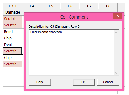 The ability to add a comment to a specific cell is new. In previous versions of Minitab it was possible to add a comment to a worksheet or column only. Now we can select the Comment option to add a comment to a cell: