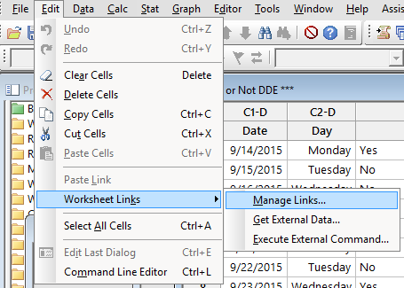 After saving the commands for the graphs I wanted to create in a GMACRO titled busydays.mac, I used the Edit menu shown below to add my macro to my DDE link: