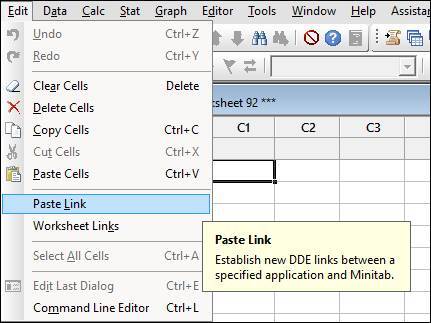 After copying the data from Excel, I navigated to my Minitab worksheet, clicked in the column where I want to link the data, and then used Edit > Paste Link:
