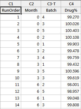 Shown below is a sample of the first 14 rows of a Stability Study data set. The full data set can be found in our Sample Data folder within Minitab Statistical Software, via Help > Sample Data in Minitab 17.3 and later versions. Search for and open the ShelfLife.mtw file. You can download a free 30-day trial of the software if you're not already using it.