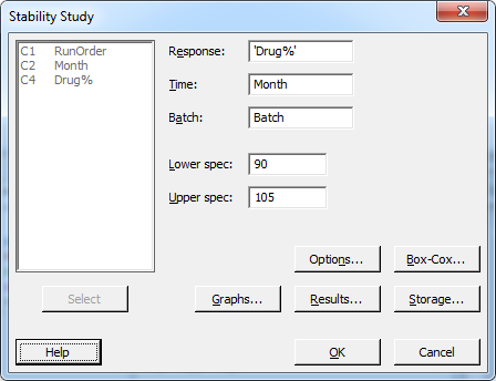 You use a stability study to analyze the stability of a product over time and to determine the product's shelf life. In order to run this in Minitab, you need: