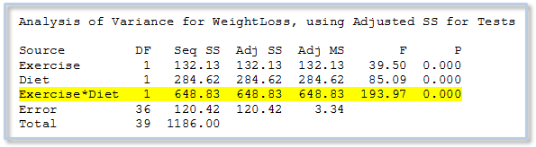 We can see that the p-value for the Exercise*Diet interaction is 0.000. Because this p-value is so small, we can conclude that there is indeed a significant interaction between Exercise and Diet. So which diet is better? Our data suggest it’s like asking “ketchup or soy sauce?” The answer is, "It depends."
