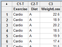 Let’s use a weight loss example to illustrate how we can evaluate an interaction between factors. We're evaluating 2 different diets and 2 different exercise programs: one focused on cardio and one focused on weight training. We want to determine which result in greater weight loss. We randomly assign participants to either diet A or B and either the cardio or weight training regimen, and then record the amount of weight they’ve lost after 1 month.