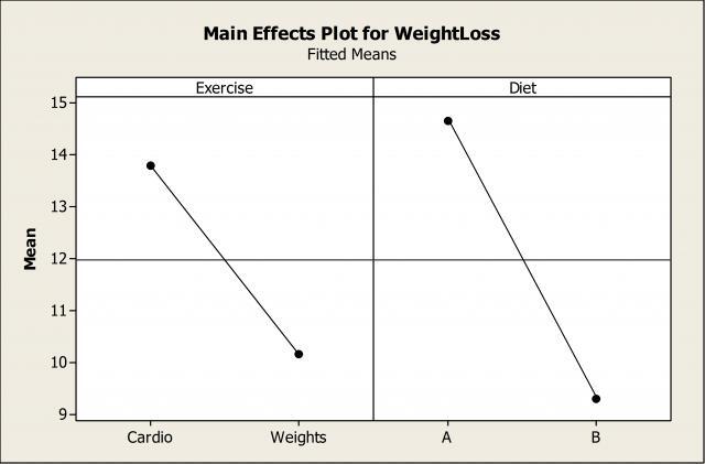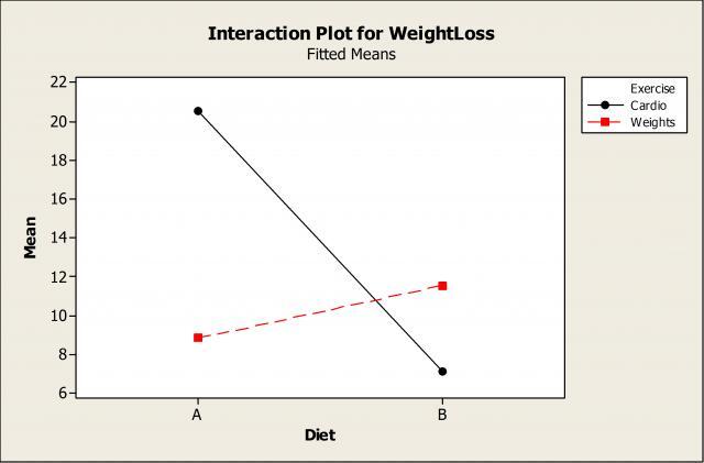 For participants using the cardio program (shown in black), we can see that diet A is best and results in greater weight loss. However, if you’re following the weight training regimen (shown in red), then diet B is results in greater weight loss than A.