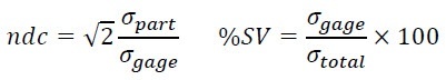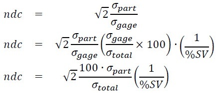 To simplify the equation and represent ndc solely as a function of %SV, we can express the variance components in another way. The total variance is the sum of two variance components, one corresponding to gage repeatability and reproducibility and the other to part-to-part variation: