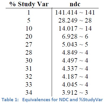 This equation clearly shows the relationship between ndc and %SV and can be used to calculate the number of distinct categories for a given percentage study variation. As shown in Table 1, the calculated ndc value is then truncated to obtain a whole number (integer).
