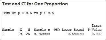 The 1 Proportion Test answers the question, “If the true population proportion is equal to 50%, how likely is it to see a sample proportion of 76%?” The answer is given as the p-value, which for this dataset is 0.007. That’s not very likely.