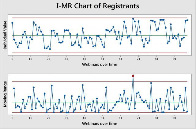 A lot can change in a 6-year time period. Perhaps there was a change in the webinar process that affected registrations. To determine whether or not I should use all of the data, I used an Individuals and Moving Range (I-MR, also referred to as X-MR) control chart to evaluate the process stability of webinar registrations over time.