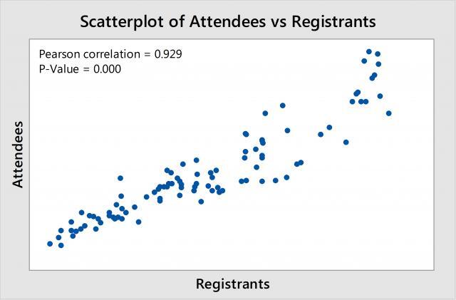 With a correlation coefficient of 0.929 and a p-value of 0.000, there was a strong positive linear relationship between the registrations and attendee counts. If registrations are high, then attendance is also high. If registrations are low, then attendance is also low. I concluded that I could use the registration data—which is both easily accessible and extremely reliable—to conduct my analysis.
