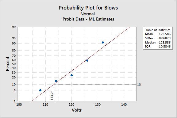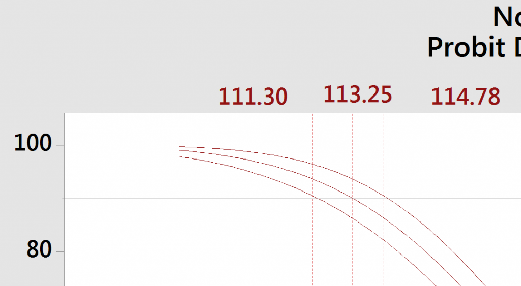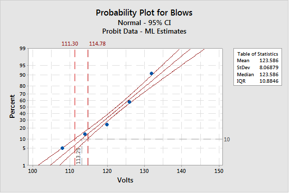 This graph plots each value against the percentage of values in the sample that are less than or equal to it, along a fitted distribution line (middle line). In probit analysis, it helps determine, at certain voltages, what the percentage of bulbs fail before 800 hours.
