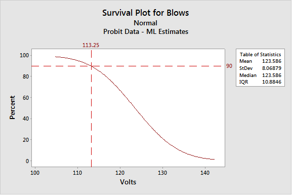 The probability plot is saying that at a voltage of 113.25, 10% of your items are failing. Conversely, the survival plot will show that 90% of your items will survive at that same voltage.