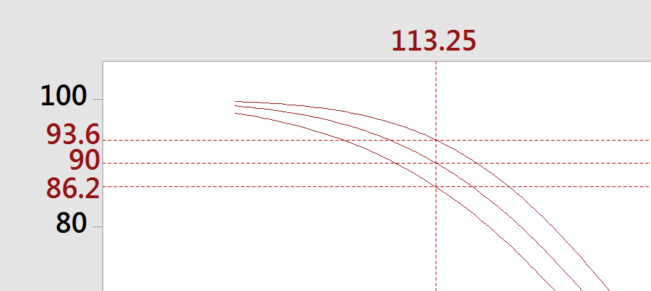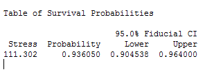 Our 95% CI (111.302 to 114.779) is around the value of 113.246 volts. In our survival plot, the confidence interval is calculated around the probability of survival. You can see this in the session window under the Table of Survival Probabilities. The 95% CI around the survival probability of 0.90 for a voltage of 113.246: