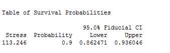 Notice that the survival probability for the lower CI of 113.246 ends up being the upper bound of the survival probability of 0.90. Given that the survival probabilities are one minus the failure probabilities, it makes sense that you'd have to look at the upper bound of a survival plot when analyzing the lower bound of a probability plot.
