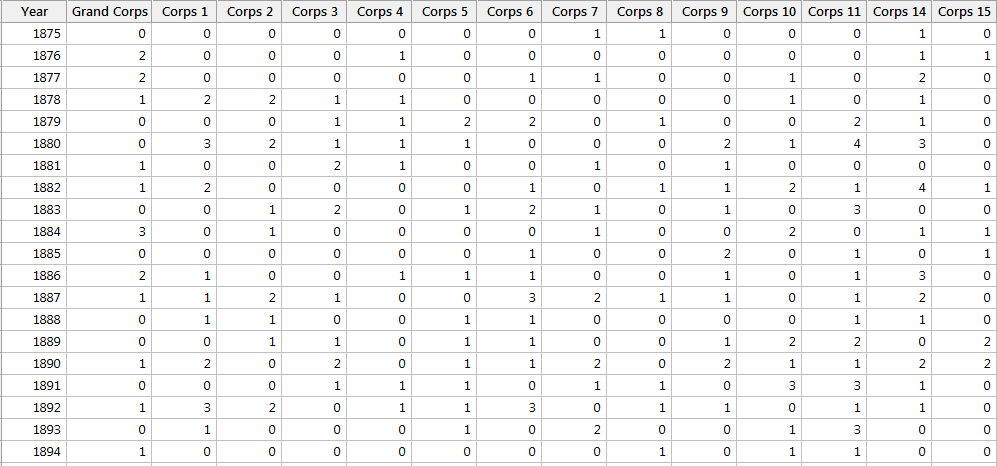 Bortkiewicz researched the annual deaths by horse kicks in the Prussian Army from 1875-1984. Data was recorded from 14 different army corps, with one being the Guard Corps. (According to one Wikipedia article on the subject, the Guard Corps may have been responsible for Prussia’s elite Guard units.) Let's take a closer look at his data and see what Minitab has to say using a Poisson goodness-of-fit test.