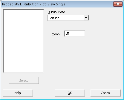 As a review, the Poisson distribution is a discrete probability distribution for the counts of events that occur randomly in a given interval of time or space. The Poisson distribution only has one parameter, which is called lambda (or mean). To divert your attention just a little bit before we run our goodness-of-fit test, let’s look at how the distribution changes with different values of lambda. Go to Graph > Probability Distribution Plot > View Single. Select Poisson from the Distribution drop-down and enter in .5 for the mean, then press OK: