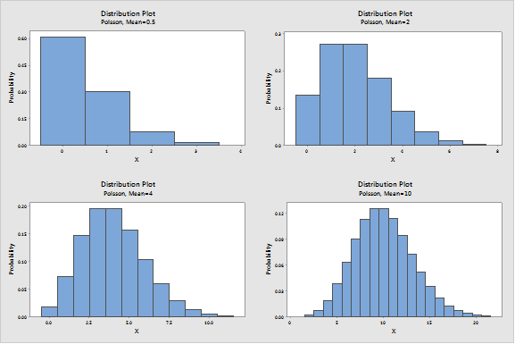 After I created my first plot, I created 3 more probability distribution plots with lambda at 2, 4, 10. I then used Minitab’s Layout Tool under the Editor Menu to combine four graphs.