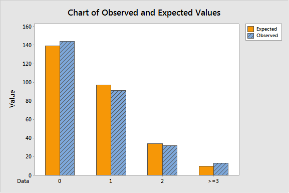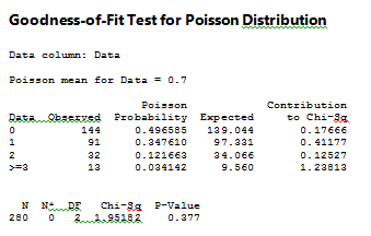 Further down you’ll see a table showing the observed counts and the Expected Counts for the number of deaths by horse. The expected counts visually mirror pretty well to what was observed. To further validate these claims that this data can be modeled by a Poisson distribution, we can use the p-value for the Goodness-of-Fit Test in the last section of the output.