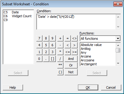 The Date calculator function is typically used to extract the date portion of a value in your worksheet. For example, if you specify date("5/11/08 12:55:35 PM") under the expression of the Calculator, Minitab will output 5/11/08. However, this functionality is also required when trying to subset by a date value. In the expression above, by adding the date function we have informed Minitab that 5/4/2012 is a date value. Without it, Minitab doesn’t know whether 5/4/2012 is a text, numeric, or date/time value. You’ll also notice that double quotes were used around the value.