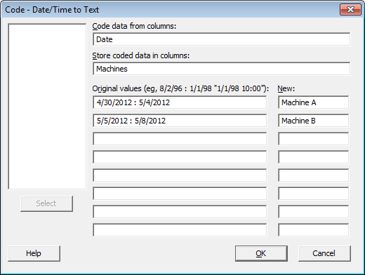 The last tool I want to mention is Code, which can be found in the Data menu. This is a good tool to use when you need to create labels or values based on date ranges. Let’s say that the range of 4/30/2012 to 5/4/2012 represents information from Machine A, and 5/5/2012 to 5/8/2012 represents Machine B. We can create a column that lists the two machines by using Code.