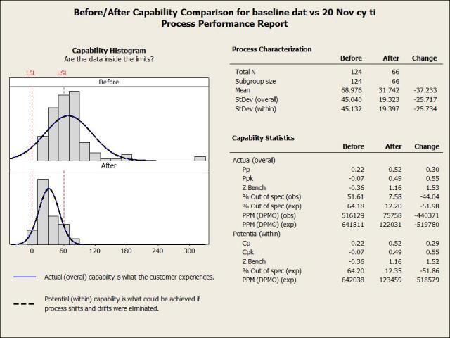 The team employed Minitab Control Charts to compare process stability before and after the new process was implemented, which helped the team confirm their solutions were meeting project goals.