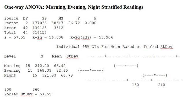 The results revealed that the evening blood sample average, taken before dinner, was statistically lower than the morning and night average readings. The analysis also suggested that the evening reading was more uniform, because it had a lower standard deviation than the other times of day.