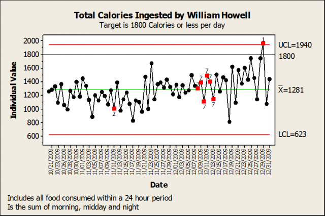 The Individuals Control Chart (Stat > Control Charts > Variables Charts for Individuals > Individuals) below shows the total calories Howell consumed in a two-month span. The chart reveals a stable process and shows that he met his caloric intake requirements the majority of the time, with the exception of one data point falling above the upper control limit (UCL). On this day, Howell consumed more calories than his target caloric intake of 1,800 calories, so he ate fewer calories the following day.