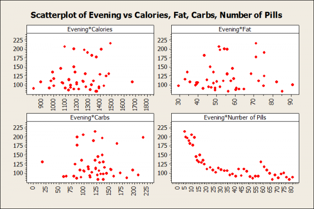 Howell also wanted to identify how process inputs (calories, fats, carbohydrates, and pills consumed) affected his process output (blood glucose levels). A four-panel scatterplot (Graph > Scatterplot) revealed a clear relationship between the number of blood glucose-lowering pills consumed and blood glucose levels. The plot shows that it took about 30 pills for Howell to reach target levels of around 100 mg/dL.